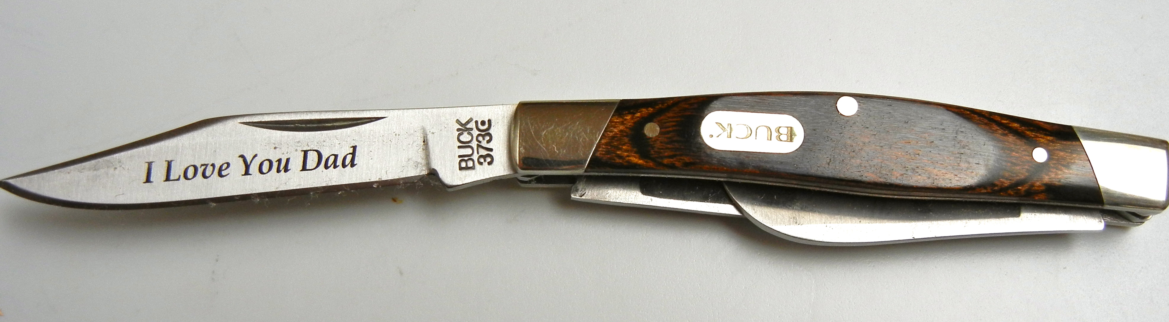 Sunday was the wedding itself. It was scheduled to be held outside but the rain poured down all morning. The decision was made to move it inside the barn (our back up plan) and fortunately the rain stopped just prior to the arrival of the wedding guests. Just before the ceremony was to begin, Linus jr gathered his groomsmen and me (I officiated the wedding) behind the tent where dinner would later be served. He gave each of his groomsmen a gift…a buck knife. He gave one to me too and said, “Dad, look what is engraved on the blade.”