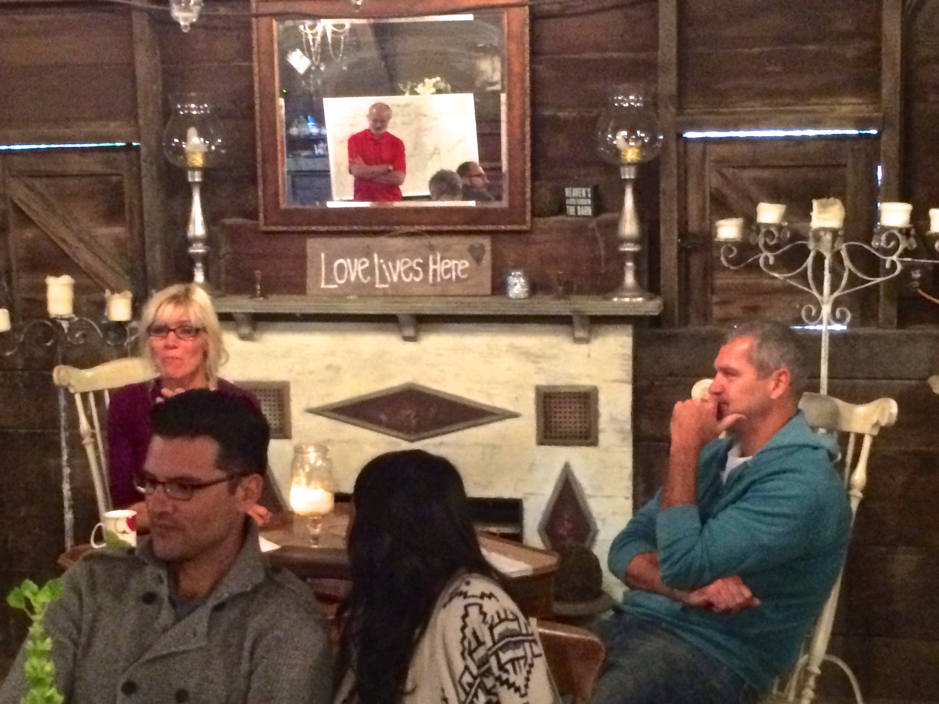 That’s Hud in the mirror with Laina and Phil on both sides of the sign on the mantle. One of the couples attending is in the foreground, as Laina was making a comment. (Okay, I’m not the best photographer, but thought is was a great shot.)