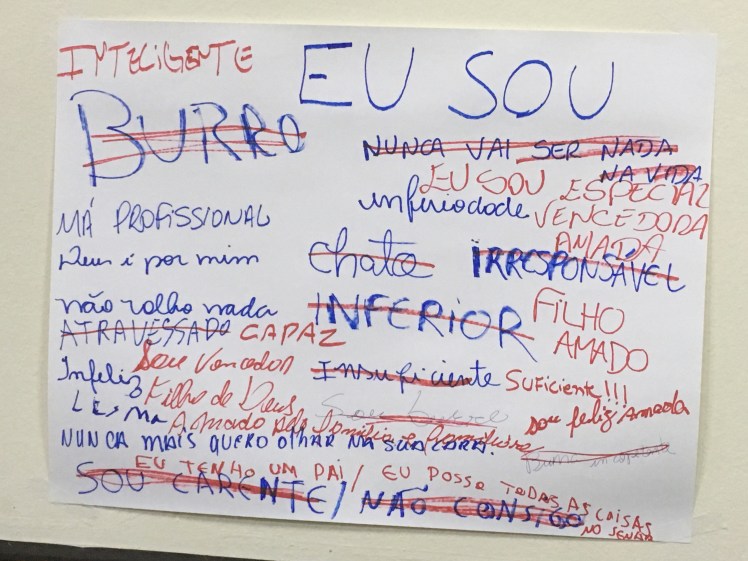 In Valinhos (120,000 people) we also conducted our Phase 2 training, “Aligning Your Heart with Father God’s.” One of our exercises is to have people cross out the lies they identify, and write instead the truth of God’s word like “Intelligent” (“Inteligente”) instead of “Stupid” (“Burro”), as in the photo below.