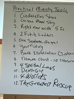 We don’t stop at presenting Romans as a roadmap. We also identify 12 practical ministry tools…just in the first 12 chapters. In case you can’t decipher these in my great artwork in the picture (we do a lot of diagramming on flip charts), here are the twelve practical tools and the verses from which we glean them: