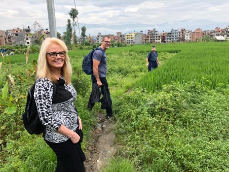 Hiking to a training through rice fields in Nepal with Divine Expedition team members Jane, Phil, and Sammy (I almost fell off that narrow muddy path before being helped by a Nepali)