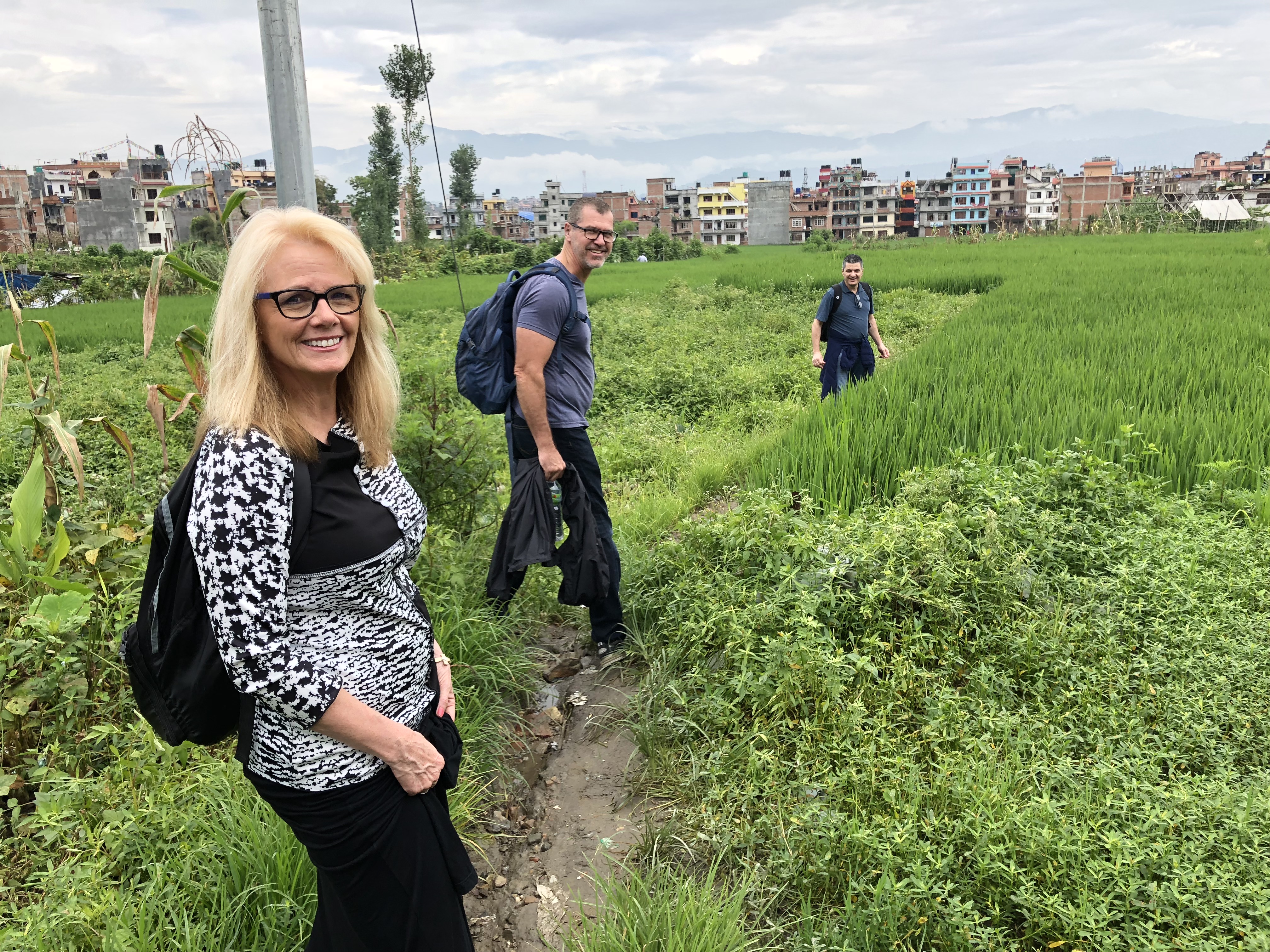 Hiking to a training through rice fields in Nepal with Divine Expedition team members Jane, Phil, and Sammy (I almost fell off that narrow muddy path before being helped by a Nepali)