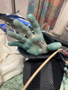 On April 2nd I had surgery on my right shoulder to replace a long standing problem. It took two and a half hours and when I woke up I not only had a new shoulder but saw a green hand coming out of a sling that had been placed on my arm. My right bicep was also green and unusually large. I thought, “Wow, I’m becoming the Incredible Hulk.”