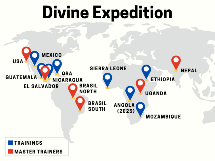 The red ornaments are locations where we have raised up Master Trainers. A Master Trainer is someone who has completed each of our four phases of training four times. This is when it becomes most exciting for us, as Master Trainers are now equipped and empowered to multiply Divine Expedition trainings themselves.